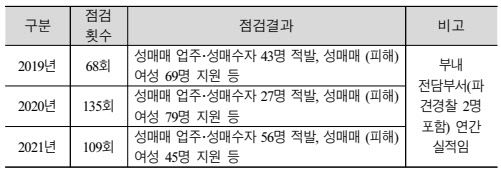 성평등부의 전신인 여성가족부는 지난 2019년 여성폭력 및 성매매 방지 점검·단속을 마련하고 대책의 일환으로 경찰청과의 합동점검·단속을 진행했다. 당시 여가부에는 전담부서인 인권보호팀이 별도로 설치돼 2명의 파견 경찰과 함께 상시 점검이 진행되는 체제였다. 그 결과 3년간 총 312회의 점검이 이뤄졌으며 성매매 업주 및 성매수자 126명을 적발하고 성매매 피해 여성 193명을 지원했다.