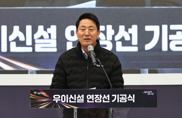 24일 서울 도봉구 방학사계광장 여름마당에서 열린 우이신설 연장선 기공식에서 오세훈 서울시장이 발언하고 있는 모습. © 연합뉴스