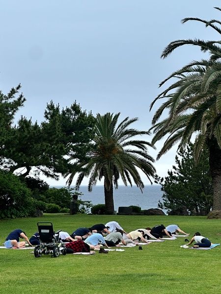 워케이션 참가자들이 탁 트인 제주 풍광을 배경으로 여가 프로그램을 줄기고 있다.제주도 제공