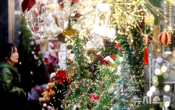 [서울=뉴시스] 크리스마스를 한 달여 앞둔 24일 대구 북구 꽃 백화점을 찾은 한 시민이 크리스마스 소품과 트리를 살펴보고 있다.