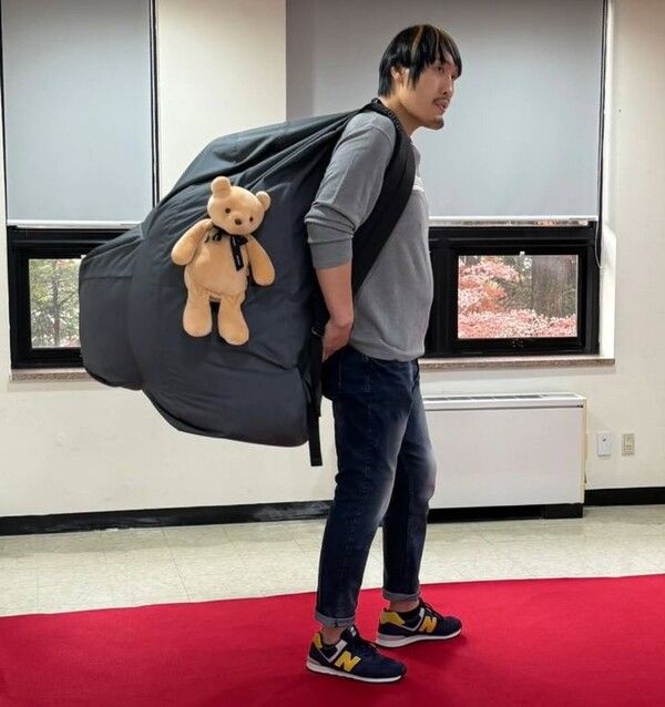 공개된 사진 속 최홍만은 온몸을 덮을 만큼 큰 가방을 멘 채 포즈를 취하고 있다. 가방 겉면에는 귀여운 곰인형이 붙어 있어 웃음을 자아낸다.