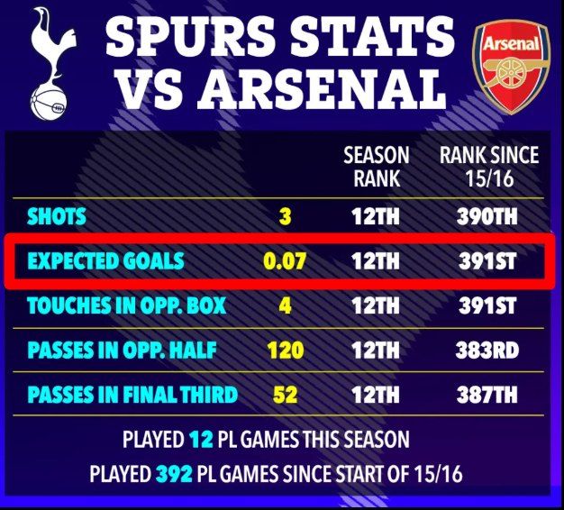 매체에 따르면 토트넘이 아스널전에서 기록한 기대득점 0.07은 지난 10년 동안 프리미어리그에서 치러진 392경기의 기대득점 순위에서 391위에 해당되는 수치이다.