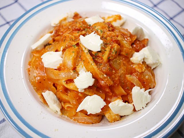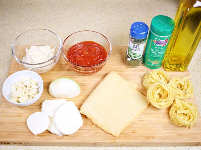 재료는 파스타면, 사각어묵, 토마토소스, 마늘, 양파,