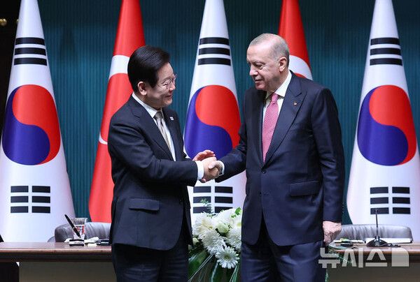 튀르키예를 국빈 방문 중인 이재명 대통령은 24일(현지시간) 레제프 타이이프 에르도안 튀르키예 대통령과 정상회담을 하고 원전·방산·문화 분야 등의 협력을 강화하기로 뜻을 모았다.
