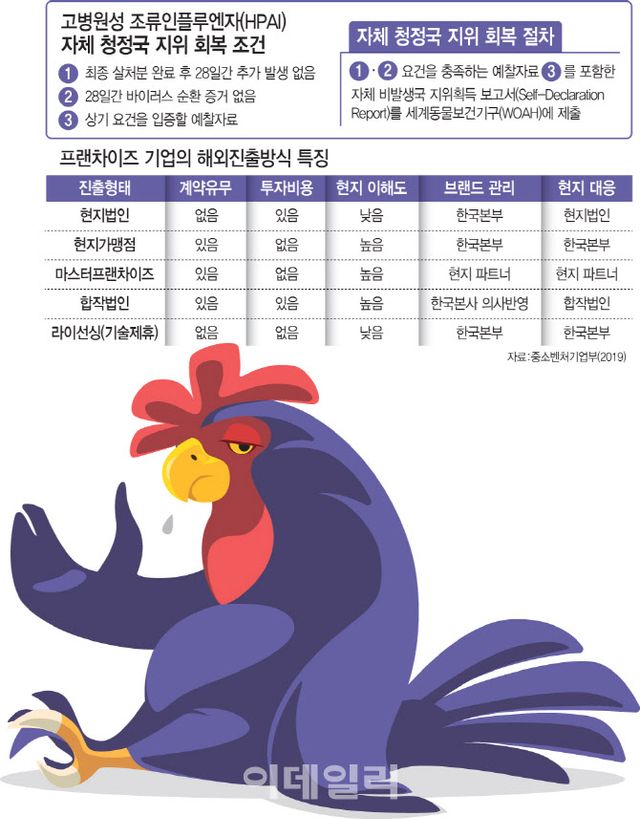 이중 현재 가장 막혀 있는 부문은 생닭 등 식품분야다. 이는 국내가 조류인플루엔자(AI) 청정국 지위를 획득하지 못해 세계 여러나라와 검역협정을 체결하지 못해서다. 검역(위생)협정이란 한 국가가 다른 국가로부터 동물, 축산물, 식품 등을 수입할 때 질병이나 병원체, 유해물질에서 안전하다는 것을 보장하는 정부간 합의(약속)문이다. 닭, 돼지, 소 등 가축은 전염병을 옮길 수 있어 수입해도 안전하다는 근거가 필요하다.