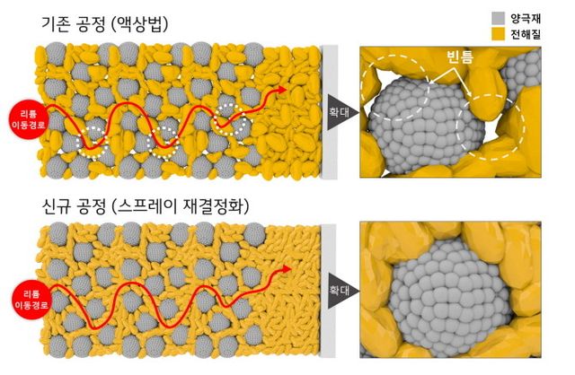 기존 공정(액상법)으로 만든 전해질은 입자크기 불균형으로 빈틈 발생해 리튬 이온의 이동을 저해하고, LG화학의 신규 공정(스프레이 재결정화)은 전해질 입자크기 균등해 리튬 이온의 이동이 원활하다는 설명이다. ⓒ LG화학