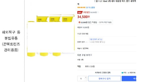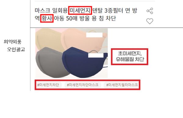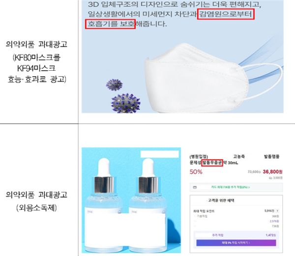 마스크, 외용소독제, 콘택트렌즈관리용품도 예외는 아니었다. 보건용마스크(KF80)를 ‘바이러스, 감염원 차단’ 등으로, 콘택트렌즈관리용품을 ‘인공눈물, 시력보호안약’ 등으로 외용소독제를 ‘무좀균약’ 등으로 광고하는 등 거짓광고가 무려 83건(72.8%) 적발됐으며 불법 해외 구매대행 광고도 19건(16.7%)에 달했다. 공산품을 의약외품의 효능·효과가 있는 것처럼 오인하게 한 광고도 12건(10.5%)에 이르렀다.