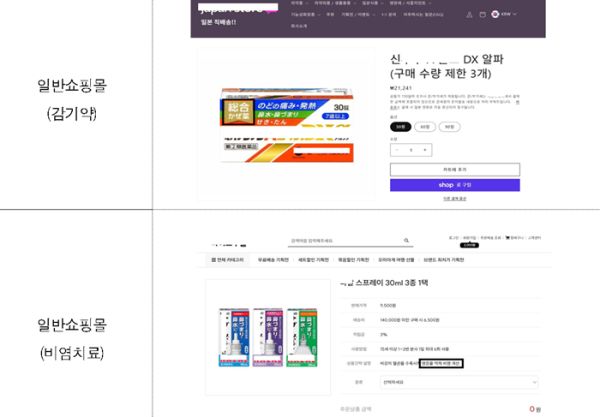 식약처에 따르면 감기약, 해열진통제, 비염약, 점안액 등의 의약품은 일반쇼핑몰(210건, 61.4%)과 카페 블로그(128건, 37.4%), 오픈마켓(4건, 1.2%) 순으로 판매를 알선하며 불법 유통되고 있었다.