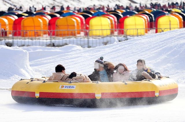 강원 평창군 진부면 오대천 일원에서 열린 제16회 평창송어축제에서 눈썰매를 타고 있는 방문객 모습. / 뉴스1