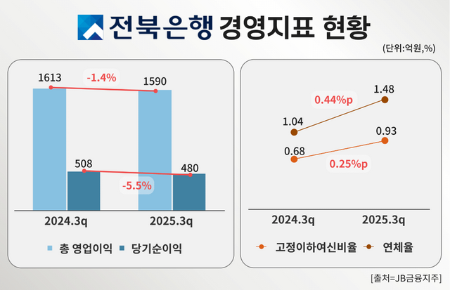 여기에 자산건전성 지표도 뚜렷한 약화를 보였다. 고정이하여신비율과 연체율 모두 상승하며 리스크 관리가 제대로 작동하지 않았다는 지적이 제기됐다. 대출 포트폴리오의 안정성이 흔들리는 가운데 전북은행이 여전히 높은 금리 마진에 의존하고 있다는 점은 더 큰 문제로 지적된다.