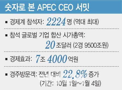 지역경제 파급 효과도 컸다. 대한상의와 딜로이트 공동 분석에 따르면 이번 서밋 경제효과는 약 7조4000억원, 고용 유발 효과는 약 2만2000명으로 추산됐다. 실제 APEC 이후 경주 방문객도 증가했다. 경주시와 한국관광공사에 따르면 APEC 행사 전후 약 한 달간(10월 1일~11월 4일) 경주 방문객 수는 589만6309명으로, 지난해 같은 기간(479만8838명) 대비 22.8% 증가했다. 이 가운데 외국인 방문객은 20만6602명으로, 전년 동기(15만2363명) 대비 35.6% 증가했다.