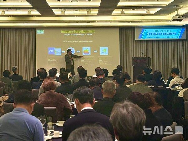 그는 젠슨 황 엔비디아 CEO의 APEC 발표 내용을 소개하며 AI 인프라 투자 규모가 2030년까지 3~4조 달러에 이를 것이라는 전망과 함께 GPU 시장, AI 반도체 생태계, 글로벌 기술 기업들의 투자 전략을 구체적으로 설명해 참석자들의 큰 관심을 끌었다.