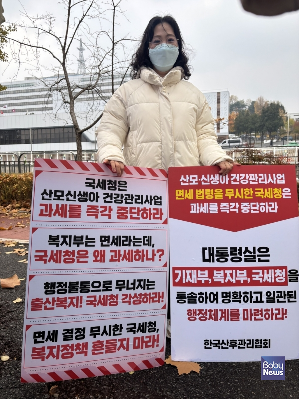 부가가치세법 시행령을 무시하고 산모·신생아 건강관리사업의 본인부담금에 부가세 과세를 추진하는 국세청을 규탄하고, 이번 사태의 유관 부서인 기획재정부, 보건복지부, 국세청 등이 스스로 문제 해결을 하지 못하는 것과 관련해 대통령실이 나서 행정체계를 마련해줄 것을 촉구하는 한국산후관리협회의 서울 용산구 대통령실 앞 1인시위가 25일 아홉 번째를 맞았다.