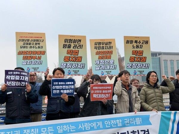 이들은 이날 기자회견에서 "이재명 정부가 지난 9월 15일 '노동안전 종합대책'을 발표하며 노동자와 명예산업안전감독관의 작업중지권 요구권 확대 등 노동자를 산재예방의 당사자이자 주체로 호명했지만 실질적 참여를 보장하지 못하고 있다"고 주장했다.