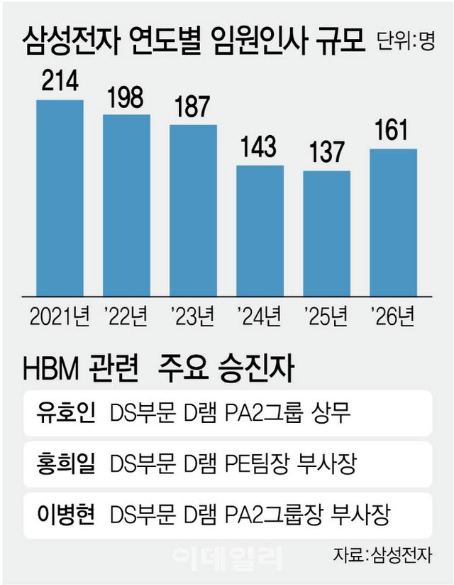 삼성전자는 25일 2026년 정기 임원 인사에서 부사장 51명, 상무 93명, 펠로우 1명, 마스터 16명 등 총 161명을 승진시켰다. 이 중 완제품(DX) 부문에서는 △부사장 26명 △상무 60명 △마스터 6명을, DS부문에서는 △부사장 25명 △상무33명 △기타 11명을 각각 배출했다. 삼성전자는 △2022년 198명 △2023년 187명 △2024년 143명 △2025년 137명으로 꾸준히 줄여오던 승진 규모를 5년 만에 늘리며 첨단산업 주도권 확보에 돌입했다.