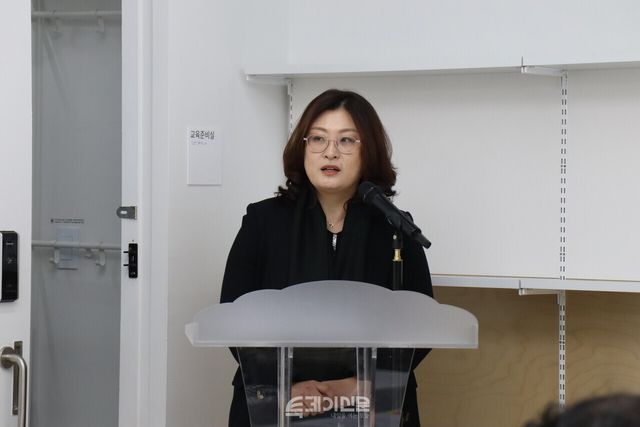 한희진 학예연구사는 전시장 내부를 돌며 작품을 직접 소개했다. 김건희 작가의 <얼얼덜덜> 앞에 선 한 학예연구사는 기대중 내란음모 조작 사건 판결문 위에 쮸쮸바 광고 이미지를 겹친 실크스크린 작업을 설명하며 “이 작품은 당시의 억압된 현실과 오락적 대중문화가 충돌하는 장면을 시각화한 것”이라고 말했다. 얼얼덜덜>