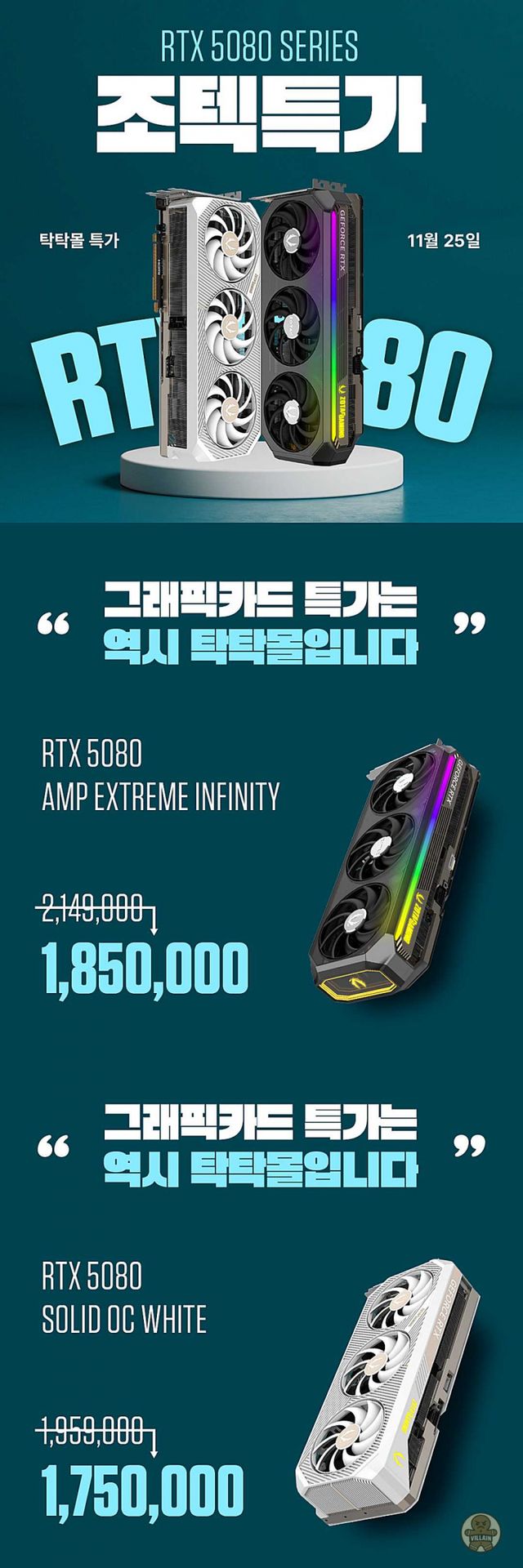 조텍코리아가 RTX 5080 시리즈 2종을 한정 특가로 판매한다. 플래그십 모델 AMP Extreme Infinity는 인피니티 미러와 강화된 쿨링 설계를 갖췄으며, Solid OC White는 화이트 디자인을 강조한 라인업이다. 두 제품 모두 블랙웰 아키텍처 기반 하이엔드 GPU로 설계됐으며, 특가는 탁탁몰에서 11월 25일부터 27일까지 또는 소진 시까지 진행된다.