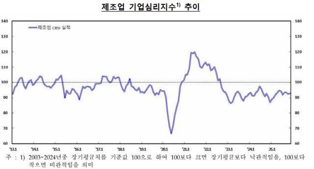 CBSI는 기업경기실사지수(BSI) 중 제조업 5개, 비제조업 4개의 주요 지표 이용해 산출한 심리지표로 장기평균치(2003~2024년)를 기준값(100)삼아 이보다 지수가 크면 기업심리가 낙관적임을, 낮으면 비관적으로 본다. 기업심리지수는 지난 2022년 10월 이래 100선을 하회 중이다.