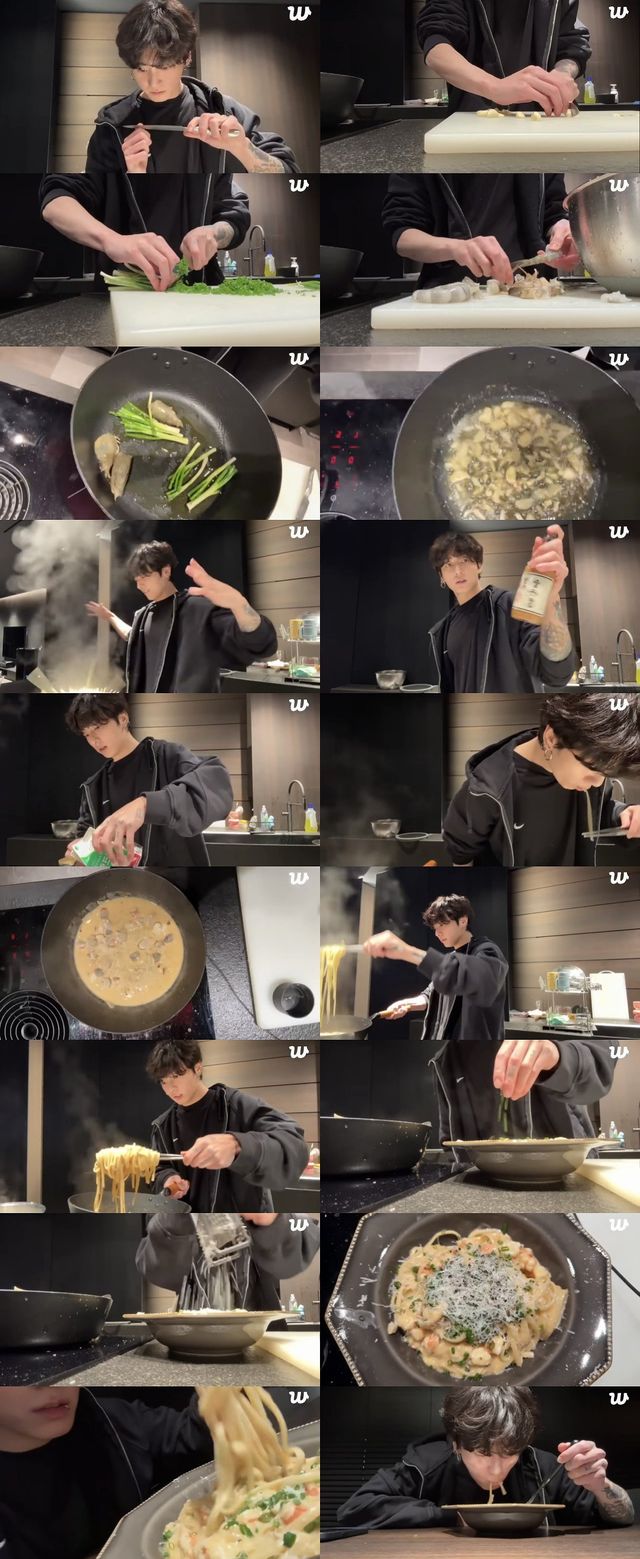 정국은 씻어둔 대왕 새우를 카메라에 보여주며 장난스러운 표정을 짓더니, 새우 머리와 몸통을 분리하고 껍질을 깔끔하게 제거한 뒤 큼직하게 썰어 준비를 마쳤다. 이후 올리브유를 두른 팬에 쪽파와 새우 머리를 넣어 파기름을 낸 뒤, 마늘과 페페론치노, 후추를 차례로 넣어 볶으며 “색깔이 너무 이쁘죠?”라며 흐뭇하게 미소를 지었다.