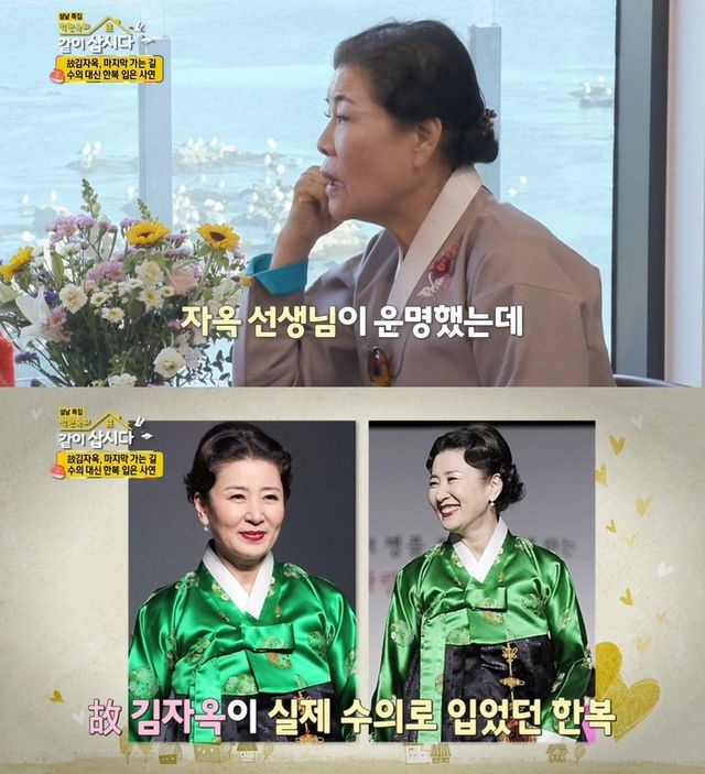 그는 "지금은 고인이 되신 김자옥 선생님이 돌아가셨을 때 개그우먼 이성미 씨가 전화를 했다. '선생님, 자옥 선생님이 운명하셨는데 선생님 옷을 입고 가신대요' 하길래 비단으로 속바지를 만들고 복주머니 해서 챙겨 보냈다"고 밝혔다.
