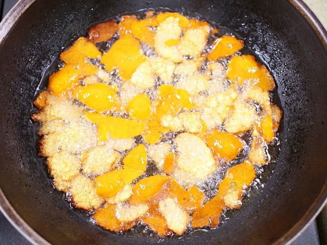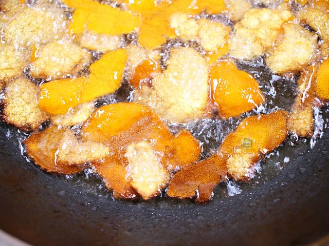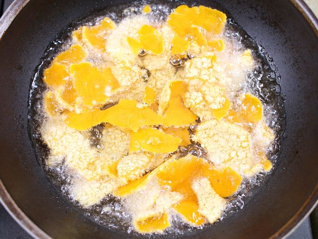 서서히 온도가 올라가면서 귤껍질이 바삭하게 튀겨져요.