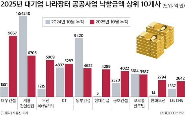 이어 △KT(5287억원) △동부건설(4622억원) △현대건설(4289억원) △금호건설(4022억원) △코오롱글로벌(3587억원) △한화오션(2794억원) △LG CNS(2642억원) 순으로 조사됐다.
