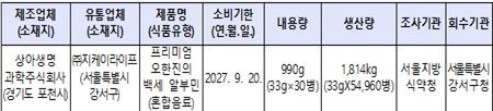 회수 대상은 소비기한이 ‘2027. 9. 20.’로 표시된 제품이다.