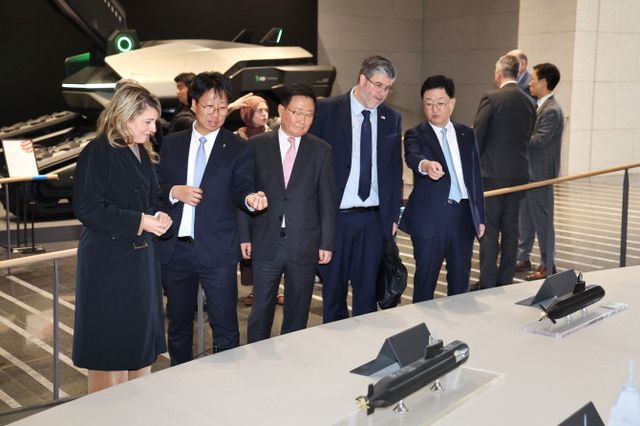 지난 25일 멜라니 졸리(Melanie Joly) 캐나다 산업부 장관과 필립 라포튠(Philippe Lafortune) 주한 캐나다 대사 일행이 조석 HD현대 부회장, 주원호 HD현대중공업 사장과 함께 HD현대 글로벌R&D센터에서 미래형 선박·잠수함·호위함 등 함정 모형을 둘러보고 있다. ⓒ HD현대