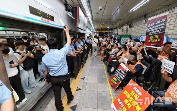 이날 오전 8시38분부터 여의나루역 상행선 열차는 전장연 시위로 인해 약 30분간 무정차 통과했다.