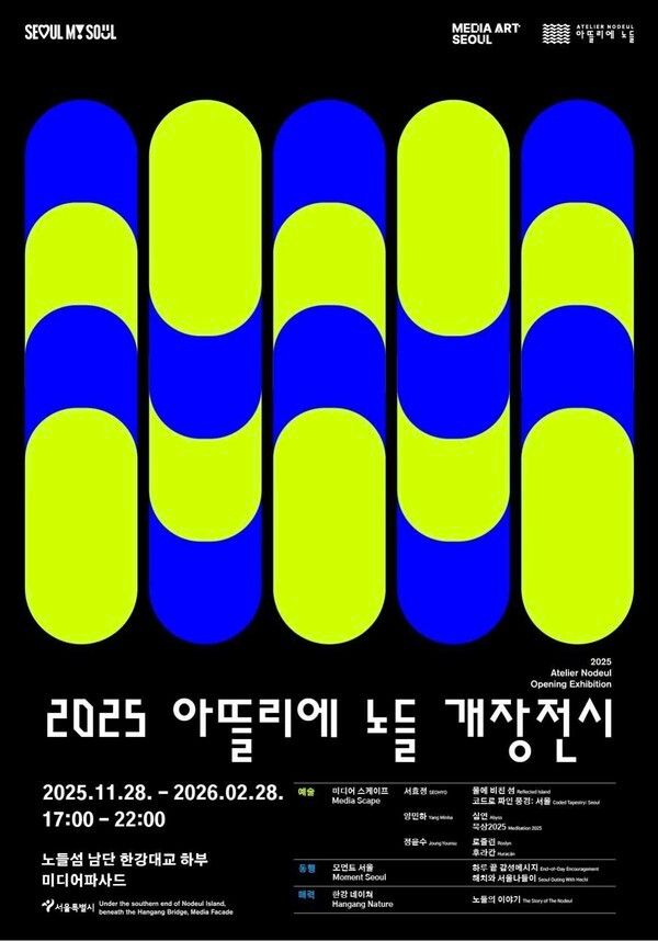 [뉴스컬처 최진승 기자] 서울시가 한강대교 하부 노들섬 남단에 공공 미디어아트 플랫폼 ‘아뜰리에 노들’을 28일 개장한다. 전시는 2026년 2월 28일까지 매일 오후 5시부터 10시까지 운영된다. 시설은 토마스 헤더윅의 ‘소리풍경(Sound Scape)’ 구상을 기반으로 조성됐다.