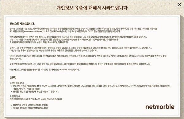 뉴시스 보도에 따르면, 넷마블은 26일 공식 홈페이지와 각 PC 게임 사이트에 "지난 22일 외부 해킹으로 인한 고객 정보 유출 정황을 확인하고 대응 중이다. 관련 법령에 따라 관계기관에 침해사고 발생 사실을 신고하고 현재 유출 원인·규모 등을 면밀히 조사하고 있다"는 내용의 사과문을 게재했다.
