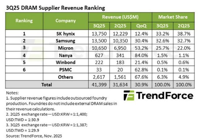 3위는 미국 마이크론으로 올해 3분기 106억5000만달러(약 15조6700억원)의 매출을 기록했다. 마이크론의 D램 매출은 전분기 대비 53.2% 급증했다. 시장 점유율도 같은 기간 3.7%포인트 뛴 25.7%였다. 트렌드포스는 “평균판매단가(ASP)와 비트 출하량 모두에서 상당한 성장세를 보였다”고 평가했다.