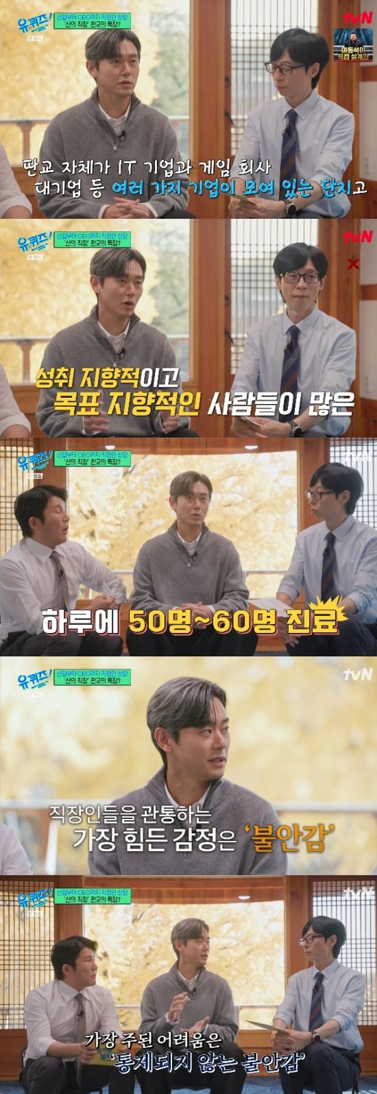 26일 방송된 tvN 예능 프로그램 '유 퀴즈 온 더 블럭'에서는 판교 신입부터 CEO까지 직장인들을 상담하는 정신과 의사 이경준이 출연해 이야기를 나눴다.