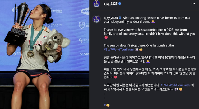(엑스포츠뉴스 윤준석 기자) 여자 배드민턴 세계 최강자로 자리매김한 안세영이 시즌 10관왕 달성 후 자신의 SNS를 통해 팬들에게 감사 인사를 올리고 올 시즌 되돌아보는 진솔한 소감을 전했다.