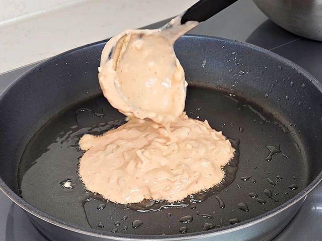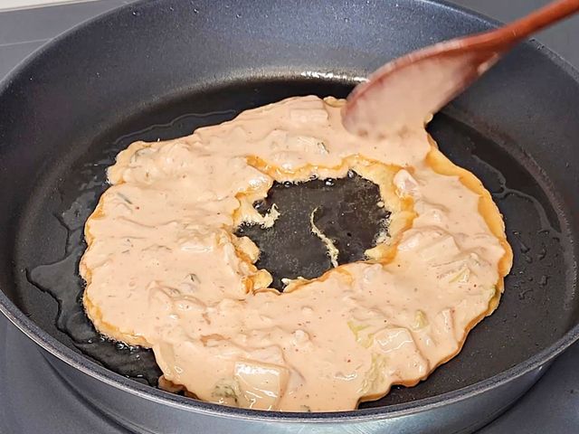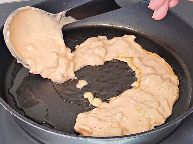 반죽을 적당히 떠서 한바퀴 훑듯이 펼쳐주시면 되고요.