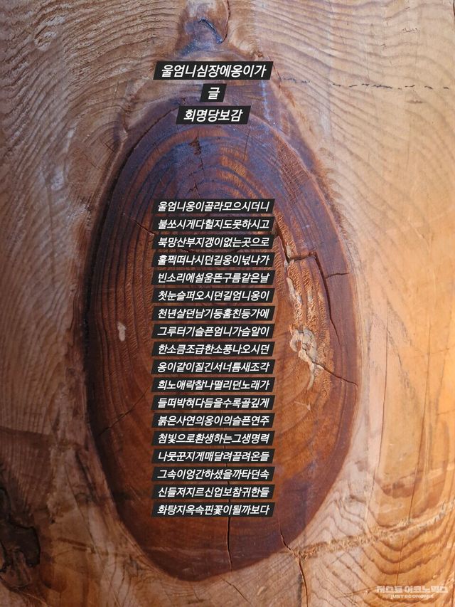 울엄니옹이골라모으시더니 불쏘시게다헐지도못하시고 북망산부지갱이없는곳으로 훌쩍떠나신엄니정지넋나가 빈소리와설움뜬구름같은날 첫눈으로오시던길엄니눈물 천년살던남기둥훔쳐등기대 그루터기슬픈가슴알이옹이 울엄니조급한소풍나오신길 옹이같이질긴서너세월틈새 희노애락찰나떨리던노래가 들떠박혀다듬을수록골깊게 붉은사연의옹이의슬픈연주 첨빛으로환생하는그생명력 나뭇꾼지게매달려끌려온들 그속이엉간하셨을까타던속 신들저지르신업보참귀한들