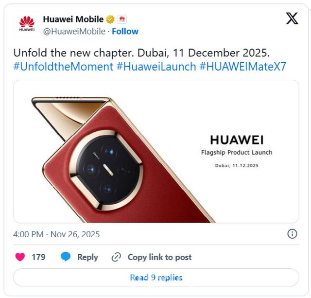 27일 IT업계에 따르면 화웨이는 12월 11일(현지시간) 아랍에미리트(UAE)의 최대 도시 두바이에서 메이트 X7 출시 행사를 통해 글로벌 시장에 선보일 예정이다. 이는 지난 25일 중국에서의 신제품 공개 직후 이뤄진 발표다.