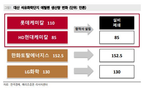 노우호 메리츠증권 연구원은 27일 보고서에서 “대산 석유화학 산단에 롯데케미칼과 HD현대케미칼의 구조재편 시도는 현재 정부의 석유화학 구조조정 정책 첫 번째 성과물”이라며 “단번에 공급과잉 해소는 불가하지만, 시도 자체를 긍정적으로 해석할 필요가 있다”고 말했다.