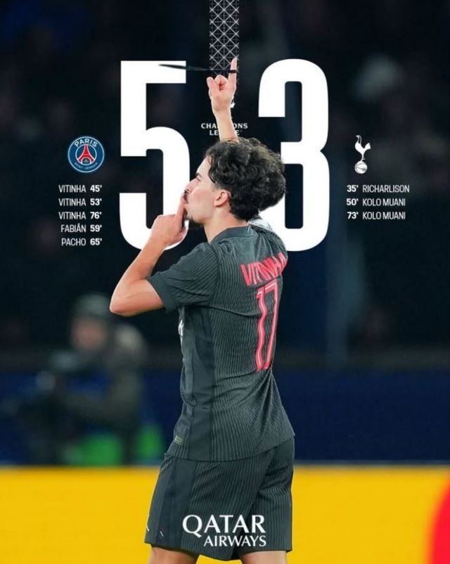 27일(한국 시각) PSG는 프랑스 파리 파르크 데 프랭스에서 열린 2025-2026시즌 유럽축구연맹 챔피언스리그 리그 페이즈 5차전에서 토트넘을 5대3으로 꺾었다.