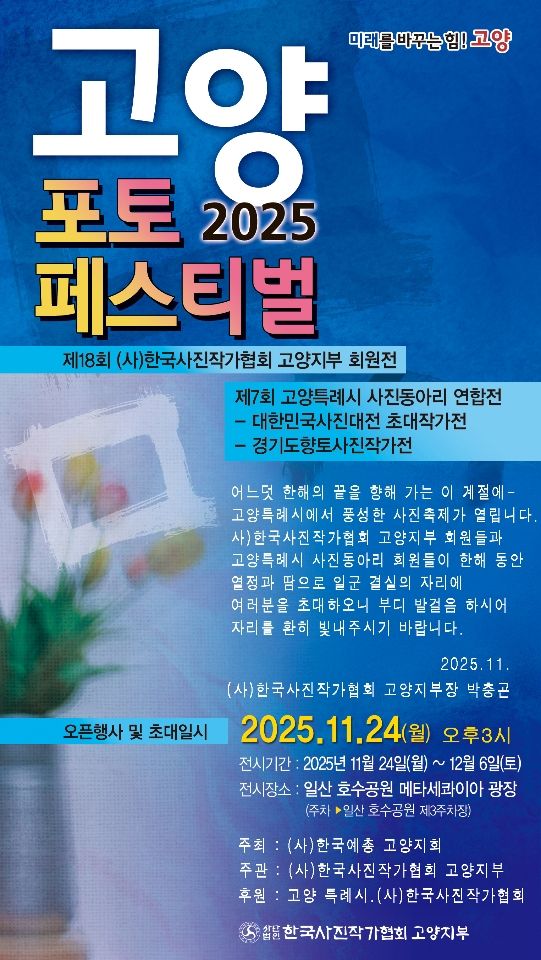 시 관계자는 “고양포토페스티벌은 고양 지역 사진작가들이 매년 참여하는 정기 전시회로, 사진을 통해 고양의 풍경과 작가들의 시선을 시민과 함께 나누는 소중한 자리”라며 “호수공원에서 예술과 자연이 어우러진 전시를 즐기길 바란다”라고 밝혔다.