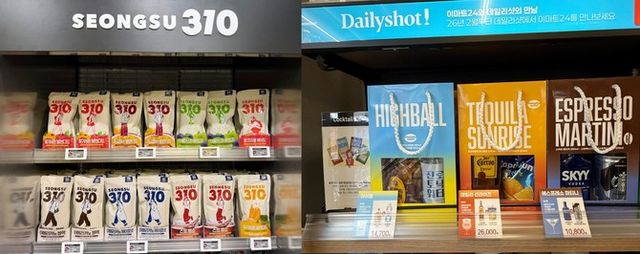 현재 냉장 커피나 파우치 음료로 출시된 '성수 310 제품' 라인업과 젋은층을 겨냥한 하이볼 DIY 키트(오른쪽). = 이인영 기자