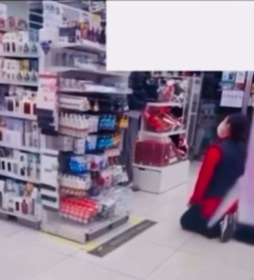 작성자 A씨가 공개한 영상에는 다이소 유니폼을 입은 중년의 여성 직원이 젊은 여성 고객 앞에서 무릎을 꿇은 채 “죄송합니다”라며 빌고 있는 모습이 등장한다.