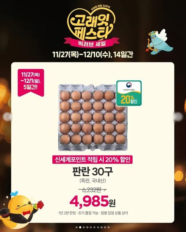 이마트는 11월 27일부터 12월 1일 월요일까지 5일간만 국내산 특란 30구 1판을 4985원 특가에 판매한다. 기존 6232원인 국내산 특란 30구 1판을 신세계포인트 적립 시 20% 할인해 4985원에 판매한다.