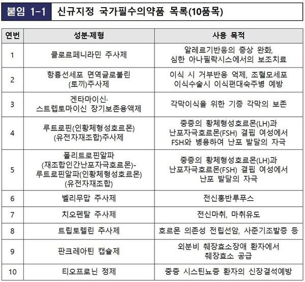뉴시스 보도에 따르면, 이번 협의회를 통해 국가필수의약품으로 신규 지정된 의약품은 난임 시술 시 난포 발달을 자극하는 목적으로 사용하는 '루트로핀 주사제' 등 난임치료제와, 면역억제가 필요한 응급상황 등에서 보조치료 목적으로 사용되는 '클로르페니라민 주사제', 전신마취 시 적용가능 범위가 넓은 '치오펜탈 주사제' 등이다. 안정공급 지원 필요성이 높은 의약품에 해당된다.