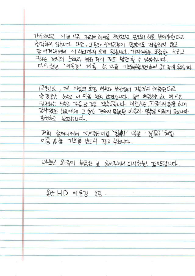 이동경은 27일 오후 구단을 통해 자신의 속내를 풀어낸 손 편지를 전했다.