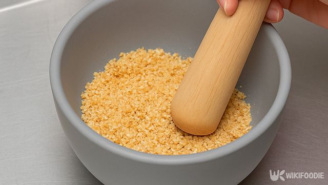 볶은 땅콩은 절구에 살짝 빻되, 알갱이가 어느 정도 남도록 한다. 너무 곱게 갈리면 두부에 바로 스며들어 고소함이 옅어진다. 알갱이가 살아 있어야 쑥갓과 두부 사이에서 식감이 선명해지고 풍미도 잘 살아난다.