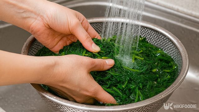 데친 쑥갓은 곧바로 찬물에 담가 열을 빼야 잎의 아삭함이 유지된다. 충분히 식힌 뒤 손으로 꽉 짜 수분을 제거해야 양념이 묽어지지 않는다. 물기가 남으면 맛이 흐려질 수 있으므로 잘 짜낸 뒤 한입 크기로 썰어 볼에 펼쳐 둔다.
