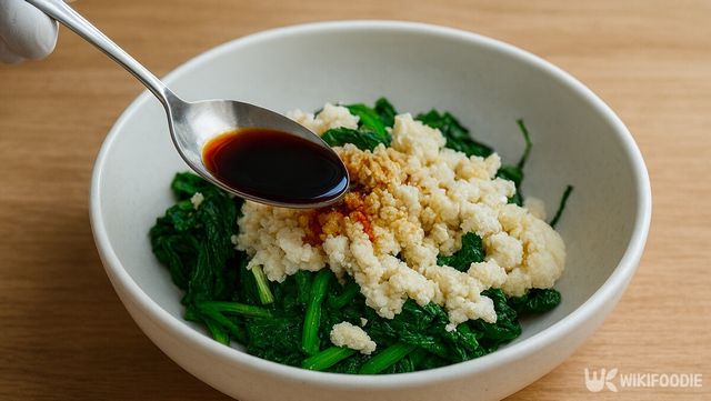 마늘 1스푼과 소금 반 스푼을 넣고, 여기에 참기름 한 스푼으로 깊이를 더한다. 거기에 국간장은 반 스푼만 넣어 은은한 감칠맛을 더한다. 양념은 두부가 뭉치지 않도록 먼저 쑥갓에 양념을 가볍게 섞어 두부가 뭉치지 않도록 준비한 뒤, 두부와 함께 버무리면 전체가 깔끔하게 섞인다.