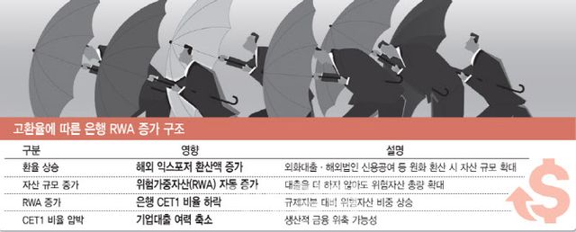 시중은행 관계자는 “환율이 계속 올라가면 대출을 더 해주지 않아도 RWA가 ‘자동 증가’하기 때문에 기업여신 여력이 제한되는 효과가 난다”며 “국내 기업의 운전자금 수요가 늘고 있음에도 작년 대비 기업대출을 공격적으로 늘리기 어렵다”고 말했다.