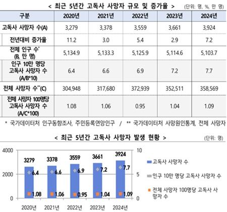 보건복지부가 2024년 11월 27일 발표한 '2024년도 고독사 발생 실태조사' 결과, 지난해 국내 고독사 사망자는 3,924명으로 2023년 3,661명보다 263명(7.2%) 증가한 것으로 나타났다.